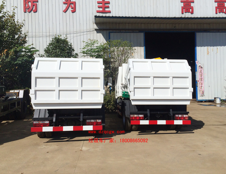 卸料結構:系用箱卸料,由兩只液壓油缸直接舉升車廂進行卸料,箱底與地面夾角不小于45度,以實現垃圾依靠自重能自行卸下的專用自卸運輸車。