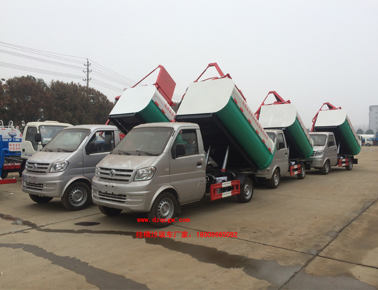 該車型符合國五排放標準,單排駕駛室,2760mm軸距,渝安70馬力汽油發動機,5檔箱,前盤后鼓式剎車,165/70R14真空胎,上裝容積約3個方。該車型的主要優勢在于車型小機動性強,一個車能配幾十個垃圾廂,能實現一臺車與多個垃圾廂聯合作業,循環運輸,充分提高了車輛的運輸能力,通常用于街道兩側的垃圾桶內垃圾的收集運用。