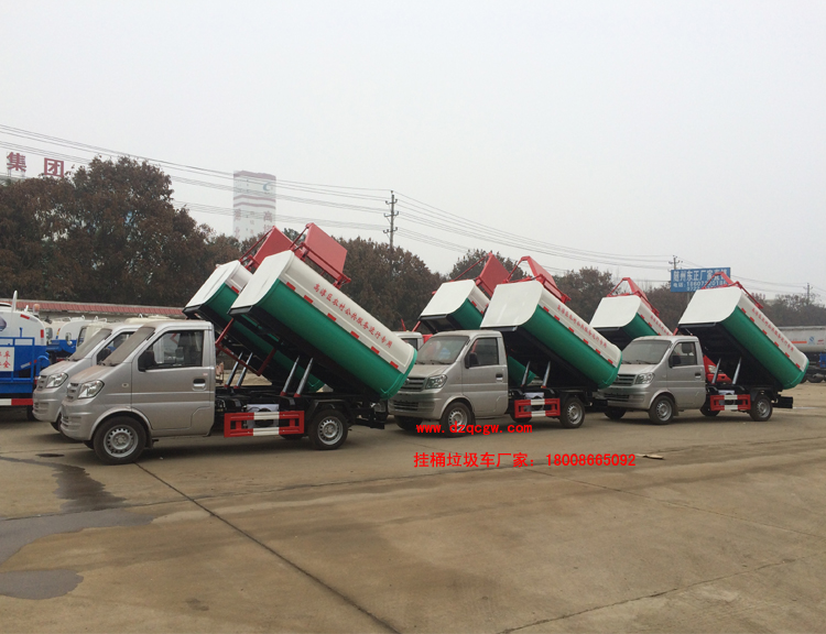 我公司掛桶垃圾車組成部分:上裝部分由密封式垃圾廂、液壓系統、操作系統組成。舉升油制缸(2支)垃圾廂可自吊上放下,上下一次工作循環時間≤50S。該掛桶式垃圾車的特點是一個車能配幾十個垃圾廂,能實現一臺車與多個垃圾廂聯合作業,循環運輸,充分提高了車輛的運輸能力,特別適用于短途運輸,如環衛部門對城鎮垃圾的清 理、運輸等。