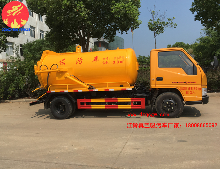 底盤說明:江鈴單排可翻轉駕駛室,國五江鈴115馬力柴油發動機,7.00鋼絲胎,油剎,五檔箱,后橋4噸,帶排氣制動,ABS。罐體有效容積3.3立方米,運輸介質:液態污物,密度800千克/每立方米.罐體外形尺寸(直段長×直徑)(mm):3000×1250. |